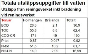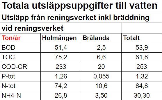 Jag uppfattar redovisningen i Miljörapporten som att alla utsläpp ligger inom de tillåtna gränsvärdena, utom då ammoniumkvävet i Brålanda som låg för högt under en period.