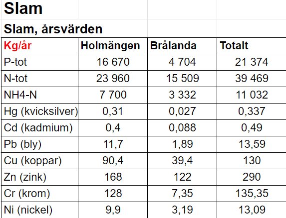 kubikmeter (precis samma mängd som året innan). Kommunen försöker återanvända slammet. På Holmängens reningsverk har det uppförts en rötkammare. Slammet bildar gas som används för uppvärmning. En del av gasen används även för att producera elström. Under 2022 producerades 374.917 kWh (år 2021 producerades 444.893 kWh). Det producerades 2.755 ton rötat och avvattnat slam på Holmängen. Det transporterades till Heljestorps kretsloppsanläggning. Där blev slammet till jord för sluttäckning av deponin. Inget slam mellanlagras längre på Holmängens reningsverk.