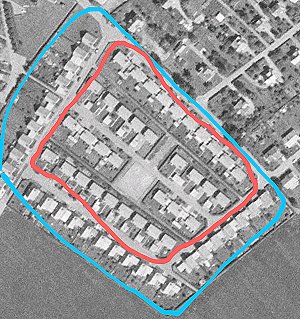 I förgrunden syns Vargöns gamla bandybana vid Sandgärdet och i bakgrunden ser man husen på Lugnets väg och Snickaregårdsvägen. Thorenius hus nr 22 är markerat med en pil. Fasaderna på de yttre husen i området var grå/vita.