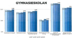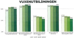 * “Gymnasieeleverna svarar mer positivt på 43 av 45 påståenden i år än 2019, medan vuxenutbildningens elever svar är mer negativt på 28 av 39 påståenden. Trots försämringar för majoriteten av påståendena ligger vuxenutbildningens resultat fortfarande högt. Möjligen har upplevelsen av distansövergången inverkat negativt på vuxenelevernas skolupplevelse i större utsträckning än för gymnasieeleverna.”