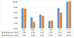 Siffrorna kan bli lite missvisande eftersom några förvaltningar har ganska få anställda. Men vi ser att det bara är på kultur- och fritidsförvaltningen och socialförvaltningen som sjukfrånvaron har ökat något. I de andra förvaltningarna har frånvaron minskat, särskilt tydligt är det i samhällsbyggnads- och miljö- och byggnadsförvaltningarna. Jag noterar också, lite förvånat men inte desto mindre glädjande, att även sjukfrånvaron i barn- och utbildningsförvaltningen har minskat, från 7,5% år 2018 till 7,3% år 2019.