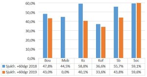 Det totala antalet sjuktimmar minskade 2019 jämfört med 2018, med 29.805 timmar. Det motsvarade 15 årsarbeten. Trots de förbättrade sjuktalen så motsvarade de totala 501.219 sjuktimmarna förra året hela 253 årsarbeten. Detta innebar en kostnad för kommunen på nästan 36,6 miljoner kronor. Det var för övrigt ungefär 281.000 kr mer än året innan.