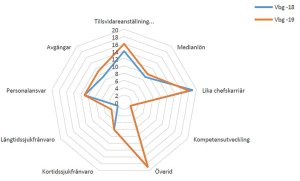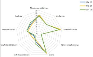 “Förbättringarna finns inom nyckeltalen: Andel tillsvidareanställda, Medianlön, Långtidssjukfrånvaro och Avgångar. Dock finns en poängminskning inom nyckeltalet Lika chefskarriär.”