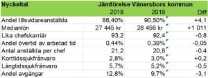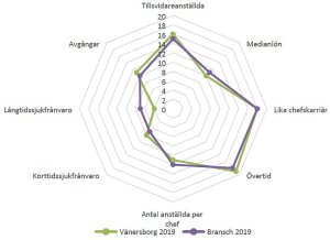 “Vänersborgs kommun har högre poäng än branschen inom nyckeltalen: Andel tillsvidareanställda, Övertid, Kortidssjukfrånvaro och Avgångar. Men däremot lägre poäng inom nyckeltalen: Medianlön, Anställda per chef och Långtidssjukfrånvaro.”