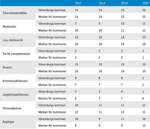 Det framgår att andelen tillsvidareanställda har ökat sedan 2018 och att Vänersborg har ett högre värde än medianen för kommuner, 90,9% jämfört med 88,4%. Däremot låg nivåerna för medianlön på en lägre