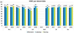 Personalen får kryssa på en 5-gradig skala och svaren räknas sedan om till ett indexvärde mellan 0-100. Indexvärdet kallas för “hållbart medarbetarengagemang” (HME). Resultatet jämförs dels med samtliga kommuner, dvs de ca 100 kommuner som använder HME, och dels med våra grannkommuner Trollhättan och Uddevalla.
