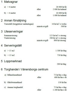 Taxor för markupplåtelse av offentlig platsmark ska höjas. Förändringarna är dock inte markerade i underlaget, så det är svårt att veta hur mycket. Markupplåtelse handlar om markhyra för t ex matvagnar, loppmarknad, torgförsäljning, trottoarpratare, containers mm. (Se bilden för ett exempel.)