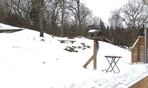 Fotot (till vänster) visar hur Jutahuset ser ut nu, med den nya altanen. Pinnarna i marken visar gränsen för tomtplatsen. Notera att tomtplatsavgränsningen inte är markerad på ett sådant sätt som byggnadsnämnden kräver. Davidsson måste markera den med ett staket, en mur eller en häck. Hur det nu ska gå till… Men allmänheten måste veta var den privata hemfridszonen ligger.