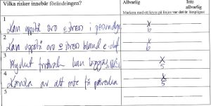 Som risker noterades att ”oro och stress” kan uppstå och ”känsla av att inte få påverka”. (Den tredje punkten kan jag inte läsa.)