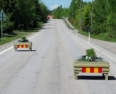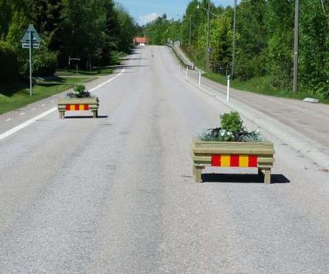 Det handlar om två blomlådor på en vägsträcka på väg 2031 genom Väne Ryr. Det är en mycket lång raksträcka med fri sikt. Kanske 600 – 700 meter. Det är tydligen frestande för många trafikanter att öka hastigheten här. Bredvid vägen finns det flera bostadshus.
